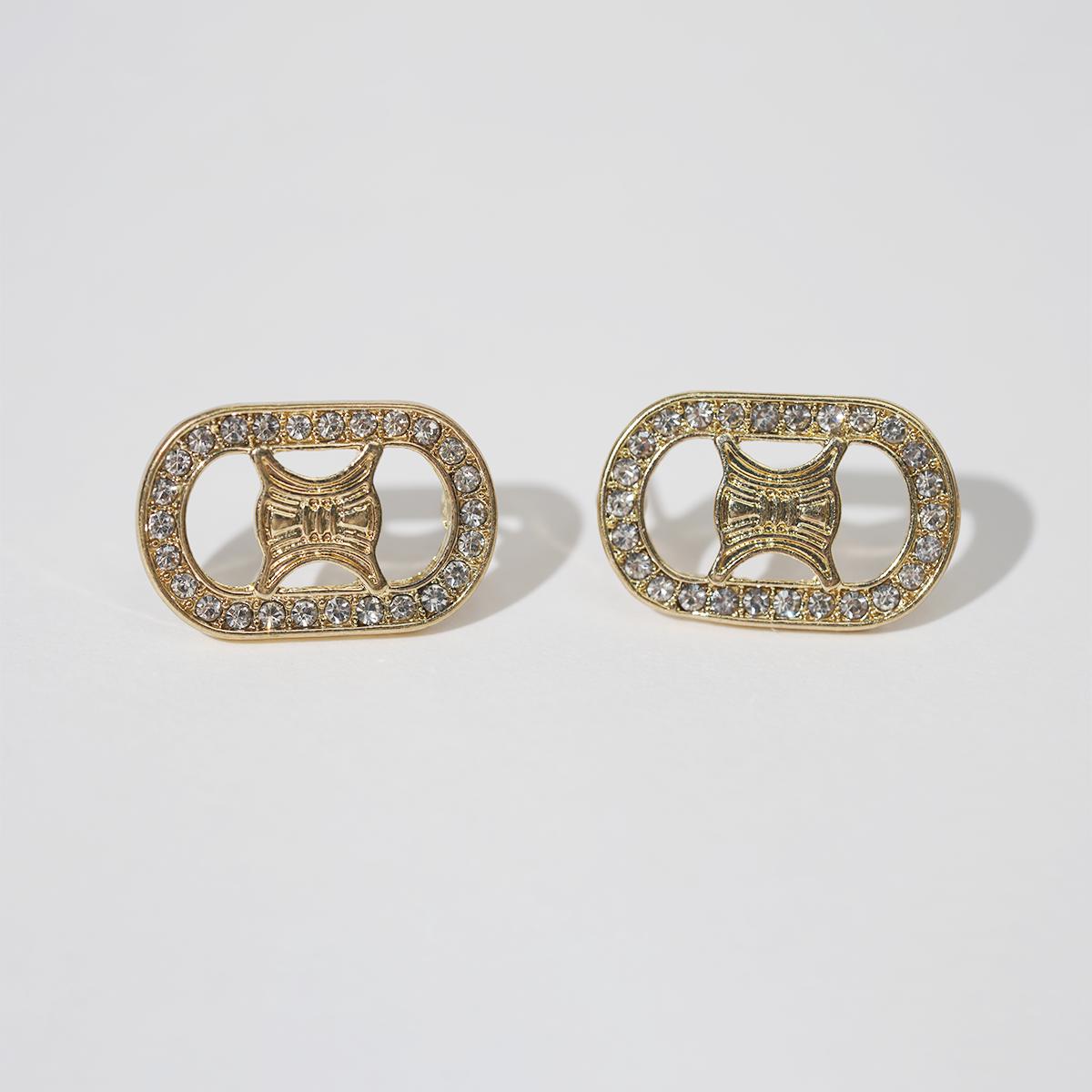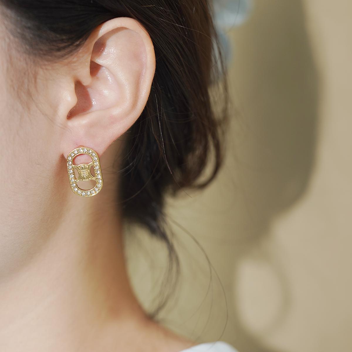 These earrings feature a gold - alloy oval shape with a unique hollow pattern. The edges are inlaid with sparkling zircon decorations, adding a touch of luxury.