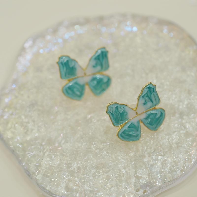These symmetrical butterfly stud earrings feature blue-white gradient enamel wings with ink-wash textured details, set on an alloy base and framed by gold-trimmed edges for refined definition.