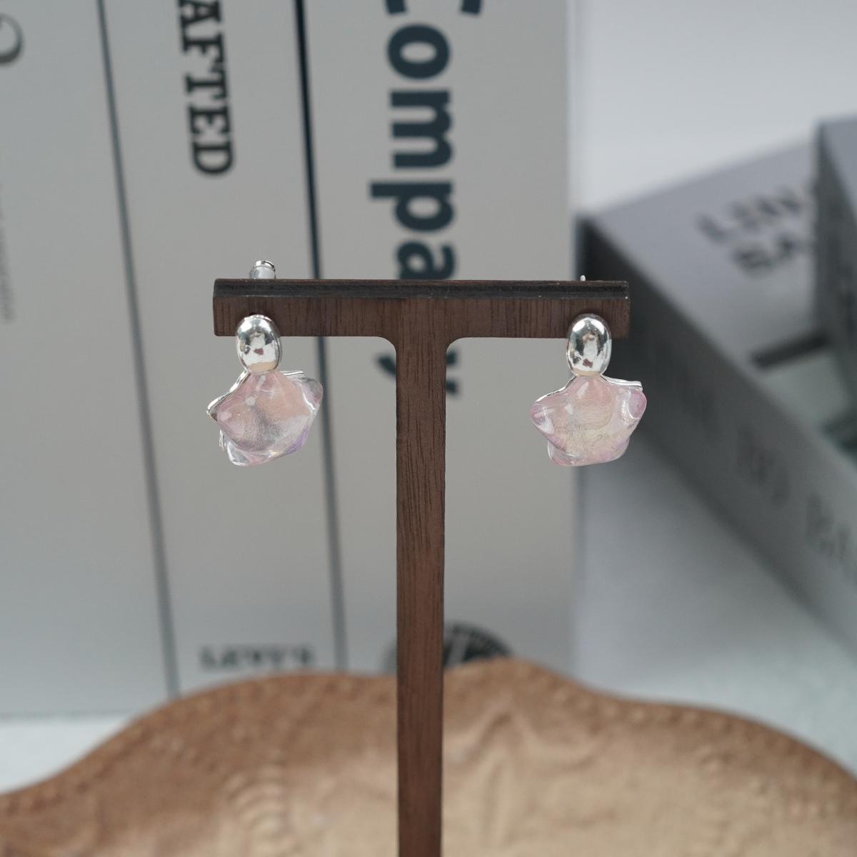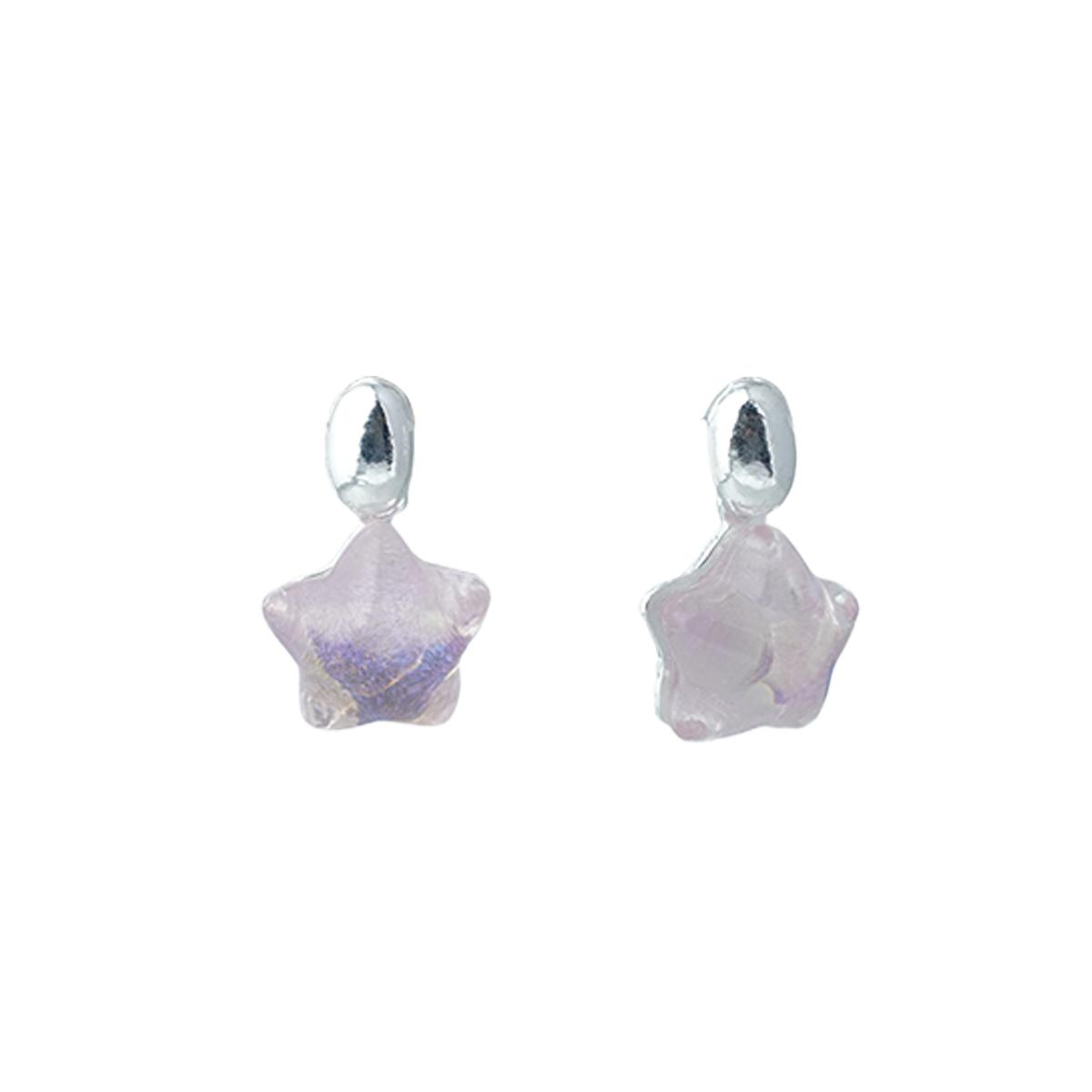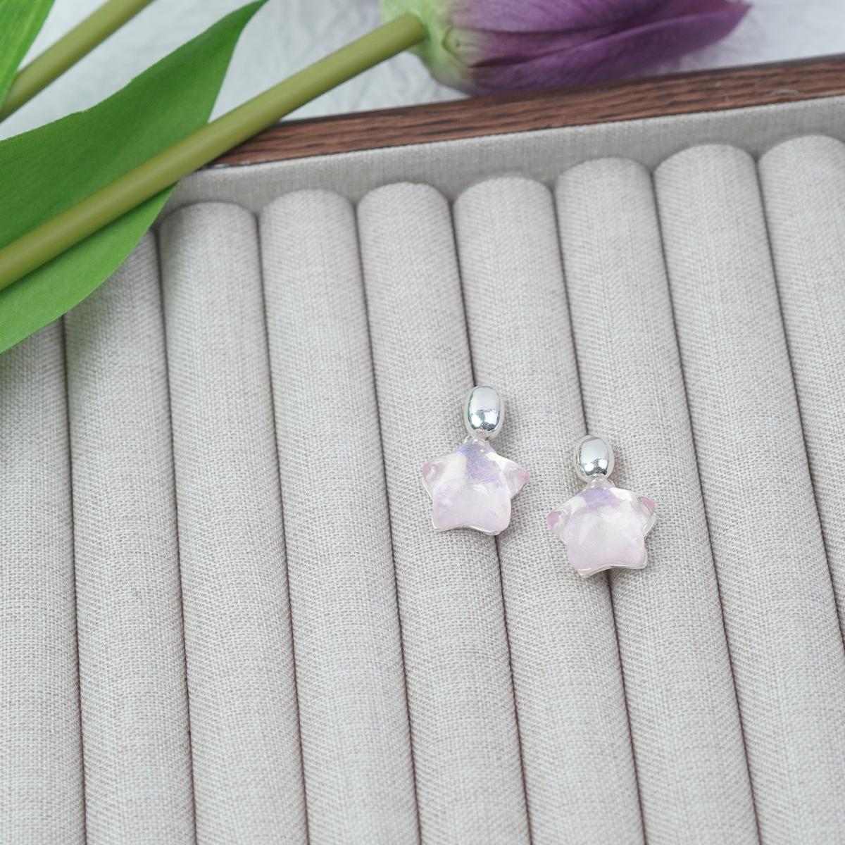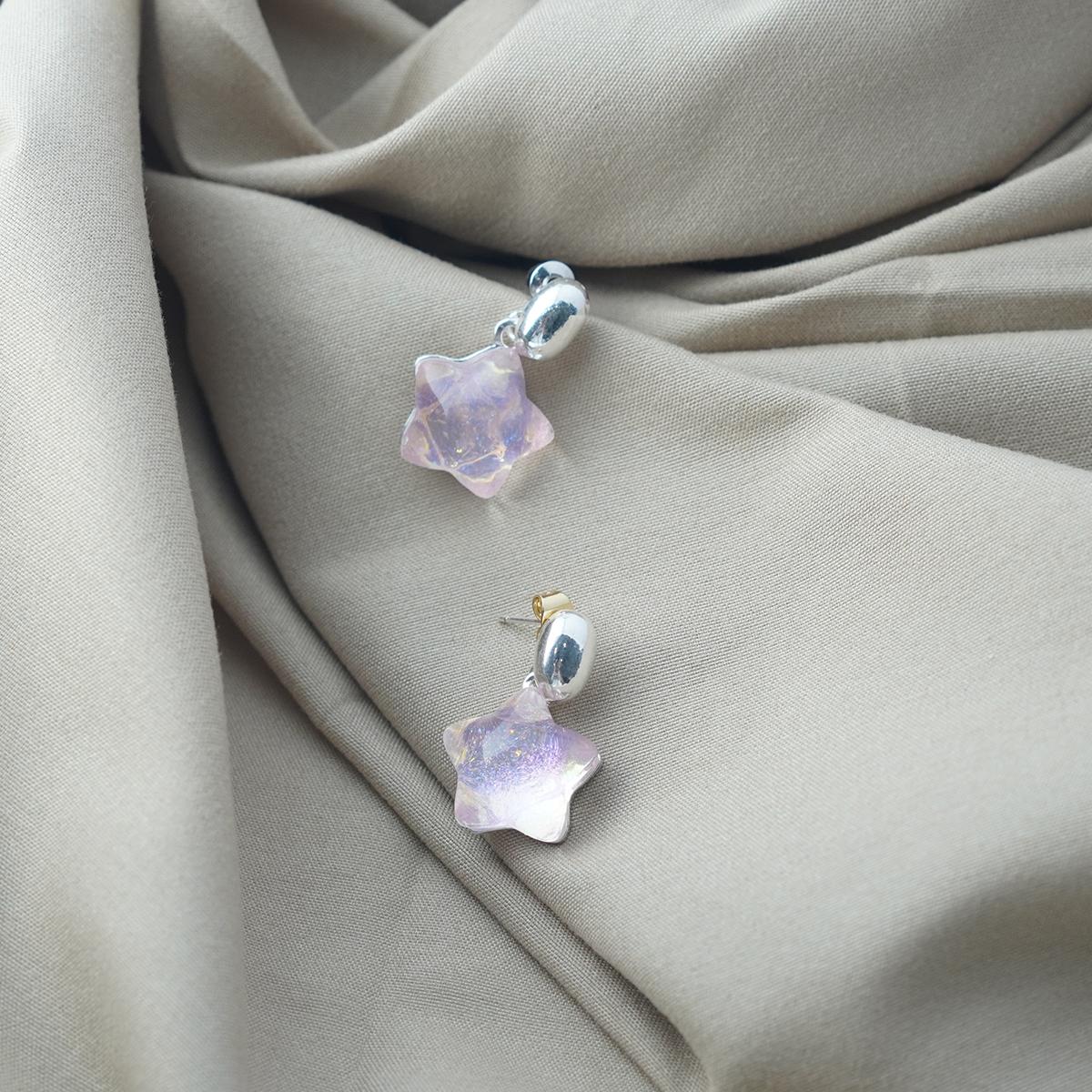 Design & Materials: These earrings feature a minimalist design—small silver - toned pendants connect to iridescent resin stars. The stars show soft hues like light purple, creating a fresh and dreamy look. They use 925 silver needles for safe wearing.