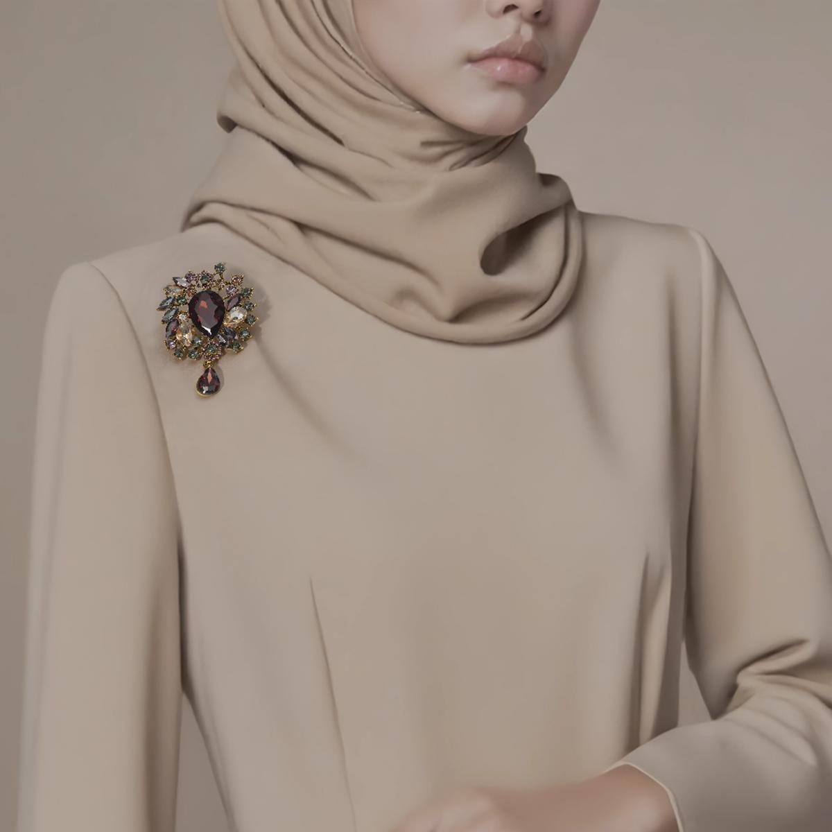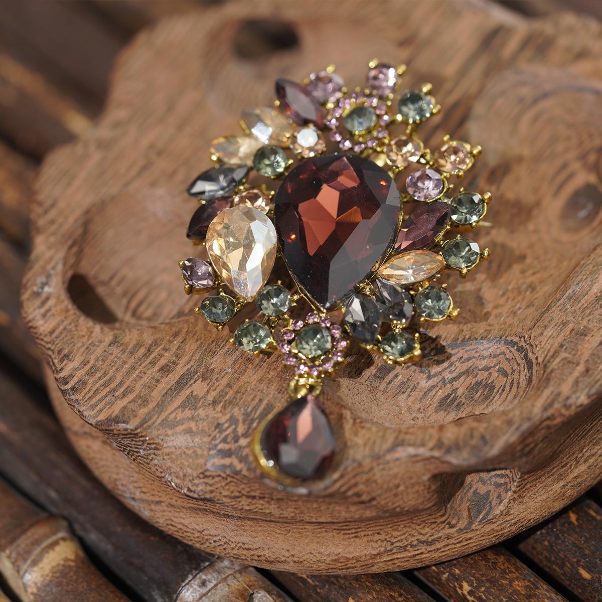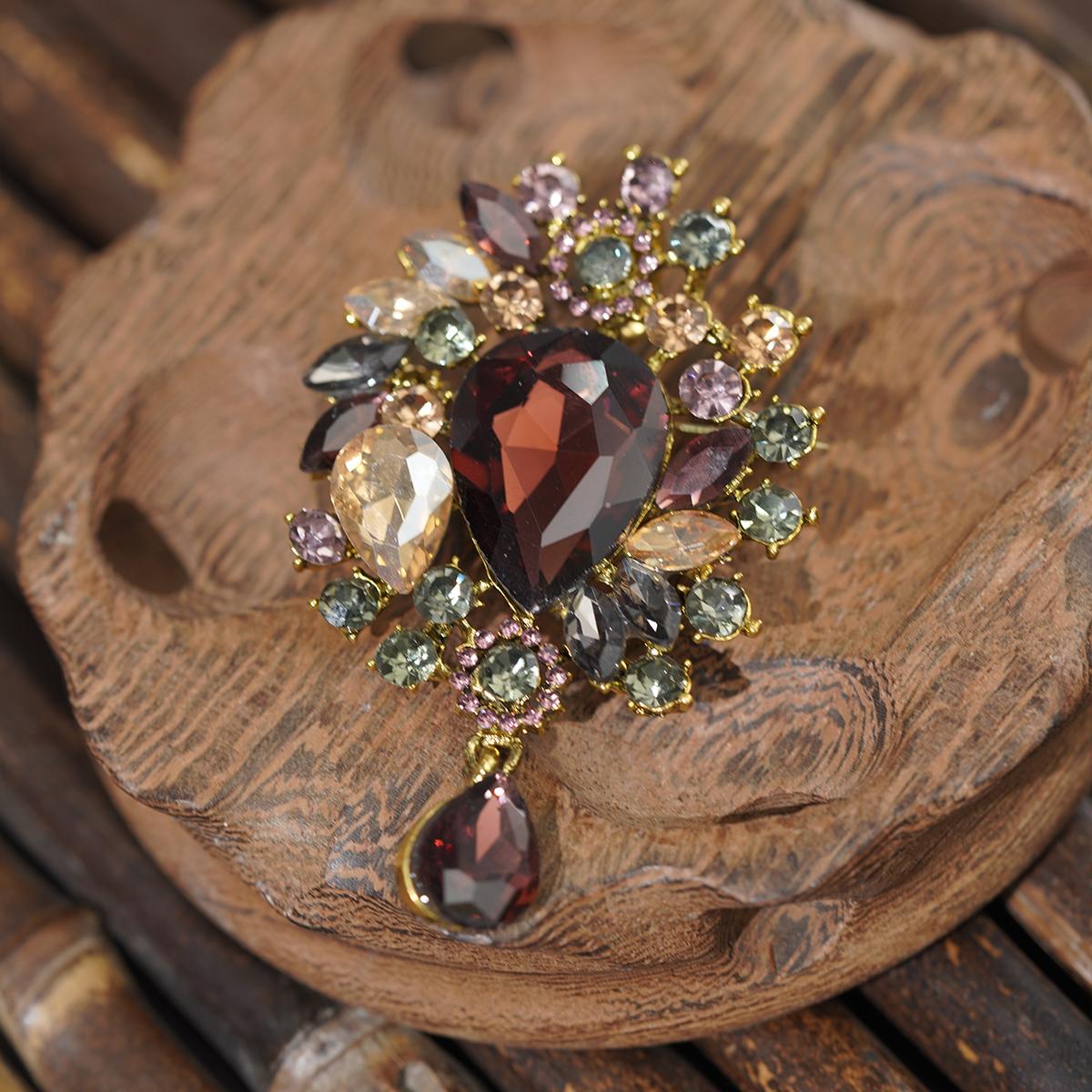A gemstone-studded brooch showcasing a deep red teardrop centerpiece surrounded by beige, purple, and green stones. Features a dangling matching teardrop pendant linked by delicate metallic elements for versatile styling.
